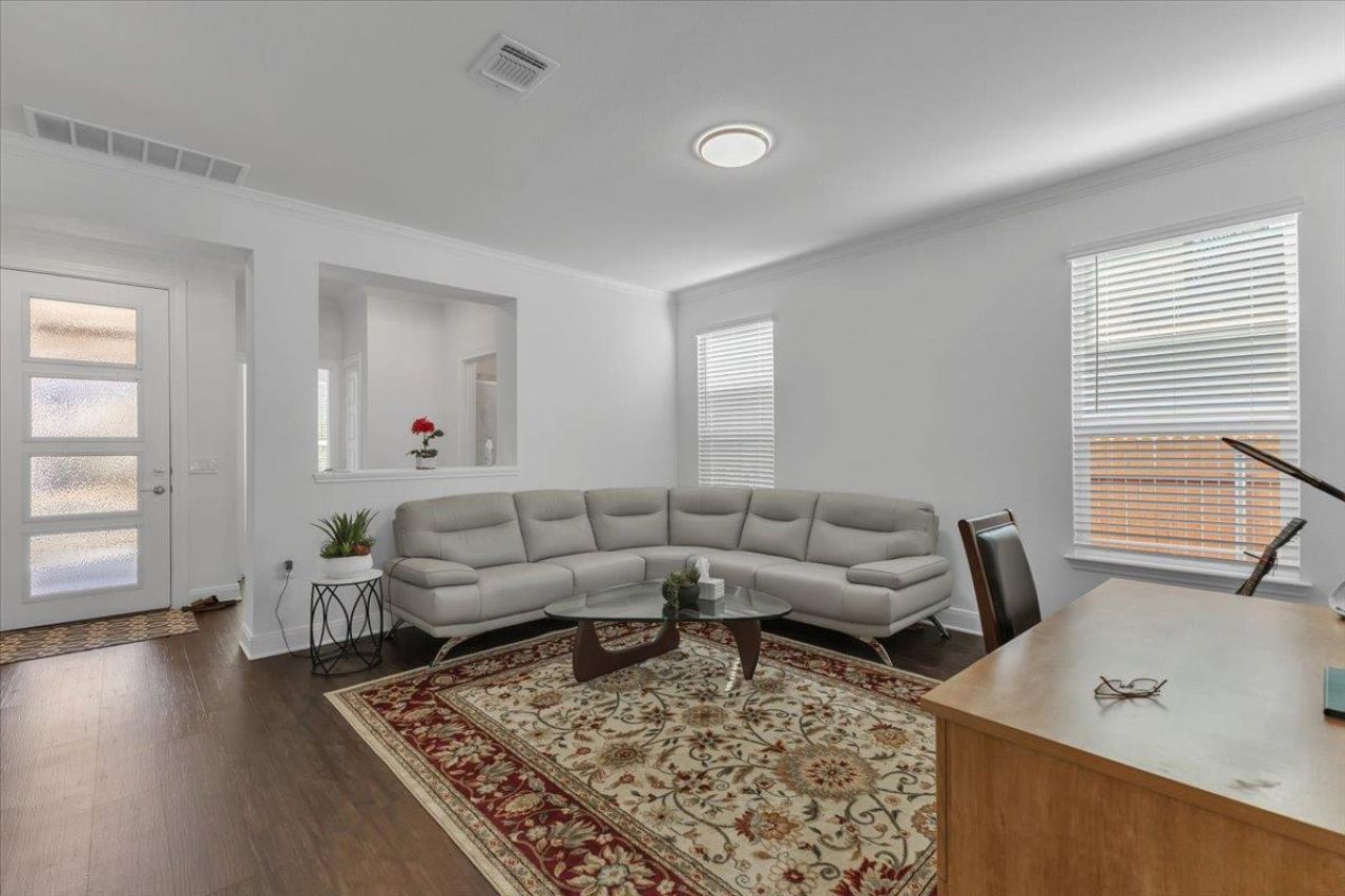 Experience energy efficiency and contemporary design in this spectacular, nearly new two-story home featuring an open floor plan and a spacious great room. Luxury vinyl plank flooring flows throughout the main living areas, complemented by multiple upgrades, including plush carpeting.The gourmet kitchen features high-end appliances, a premium refrigerator, extended breakfast/bar counter, tile backsplash, granite countertops, and a butlers pantry. The primary suite includes plush carpeting, a tiled walk-in shower with his and her walk-in-closet. A flex space with French doors provides versatility for work or play within the primary suite. Additional highlights include dual AC unit, 9 ft ceiling in both floor, a tiled fireplace, smart switches, Wi-Fi sprinkler system, water softener, smart washer and dryer, epoxy-coated garage and patio floors, full rain gutters, upgraded cabinet hardware, stair closet and covered front and back patios. This home is conveniently located just minutes from popular East Village ATX featuring shopping, dining, and live music! Short drive to the Domain, HEB, and only 15 min. from downtown Austin.