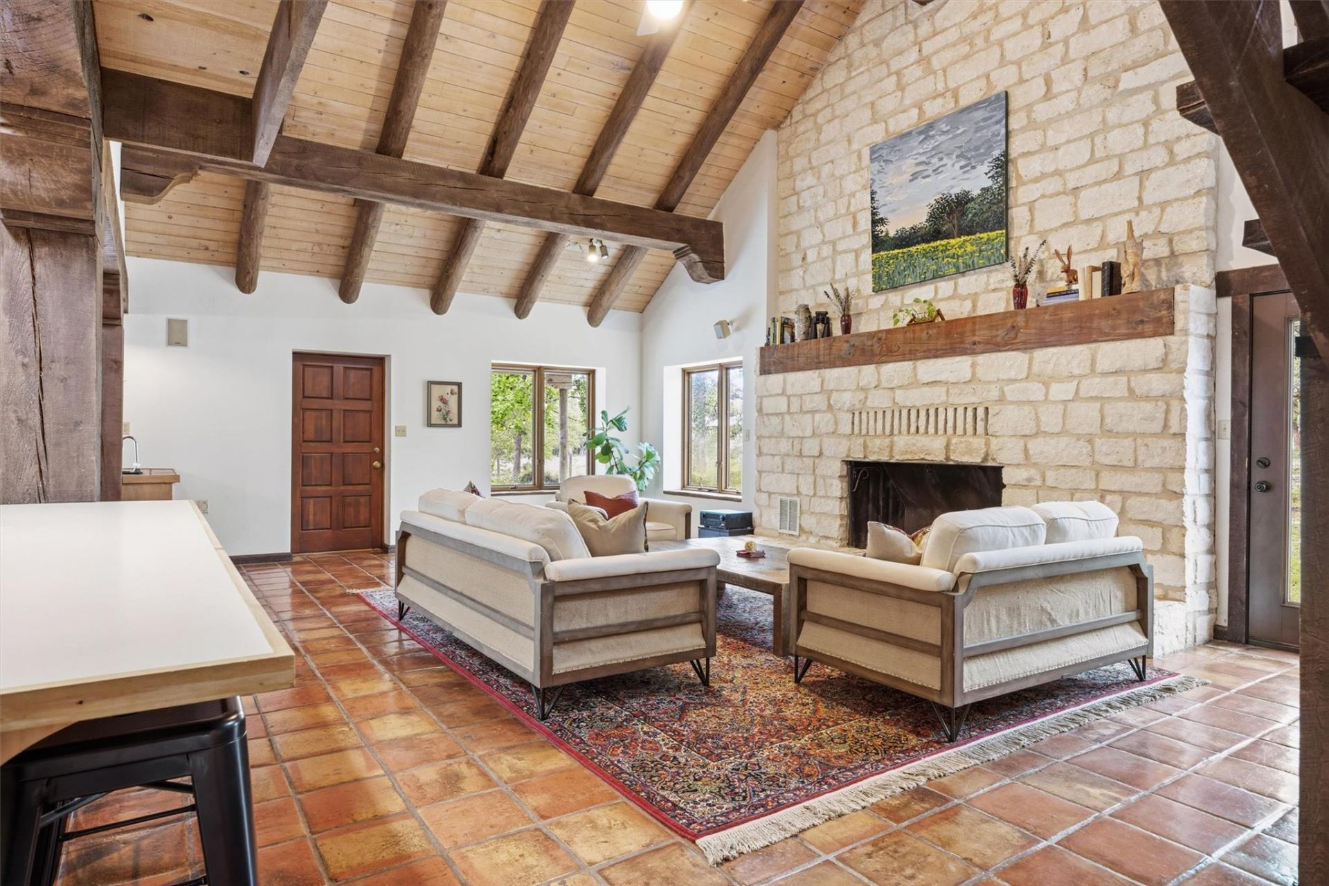 One-of-a-kind Spanish ranch estate on 29.22 unrestricted acres in the heart of the Texas Triangle ? 45 min to Bastrop, 1 hr to College Station, 1:15 to Austin, 1:45 to Houston. Starlink internet already in place.The 3,869 sf stucco home features an 20-ft vaulted great room with hand-hewn beams, tongue-and-groove wood ceiling, and a massive limestone fireplace. Saltillo tile flows throughout main living areas. The chef's kitchen centers on a large island. Covered porches front and back. Metal roof is 10 years old with an estimated 50+ years of life remaining.Two fully independent wings ? each with its own kitchen and bath ? make this an exceptional multigenerational home. The primary suite includes a 15x12 walk-in closet with built-in shelving and a flex room ideal for a nursery, office, or gym.The 1,673 sf finished and insulated 4-car garage features polished concrete floors, vaulted ceilings, a bonus loft, two large storage closets, and a built-in movie screen setup. A climate-controlled second kitchen connects the garage to the covered front porch ? heated and cooled like the main house, it functions as a true bonus living and entertaining space. A separate 6-car open carport includes an enclosed, electrified workshop.Active wildlife exemption conveys at closing ? bypassing a mandatory 5-year wait ? and can be converted to an ag exemption by simple county application. Land is fully fenced and cross-fenced with a stocked pond, hundreds of native post oaks, and gently rolling pasture. On-site well feeds the pond and multiple property spigots. County water to main house. Two leach field septic systems. Propane for hot water and garage heat. Furnishings negotiable.